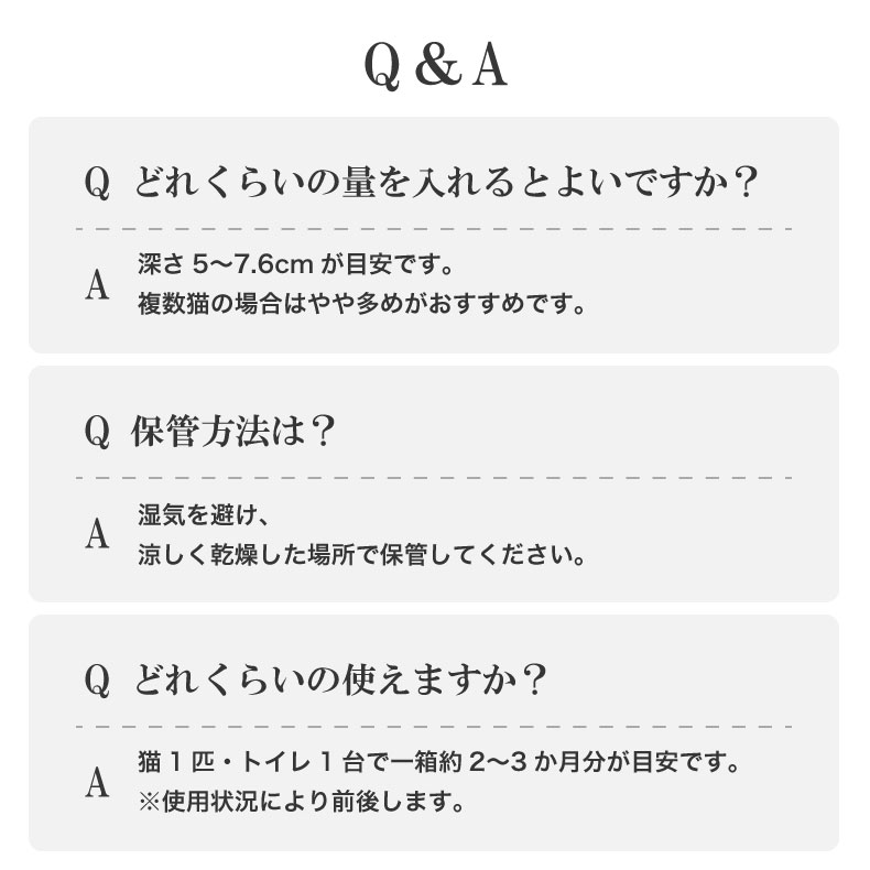 A:猫1匹・トイレ1台で約2~3か月分が目安です。